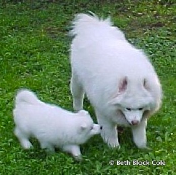They told us they thought she was a Samoyed. We had never heard of this breed so I went onto the computer and did a TON of research. We learned a lot from this first Samoyed. I loved her so much I adopted two more -- Neeka and Kedo -- and bought a puppy, Remington, who is shown in the photo to the right (with Snow E. Bear).