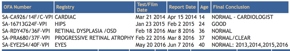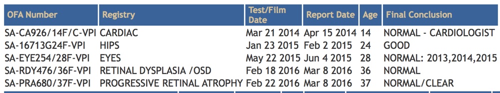 Responsible breeders have the sire and dam undergo certain health tests that are certified by the Orthopedic Foundation for Animals (OFA) and then publicly viewable on the OFA website. Before you seriously consider any puppy from any breeder, you should see the puppy’s pedigree and search the OFA website for the health test results of that puppy’s dam and sire, grandparents and great grandparents. It is also desirable to know test results of aunts and uncles.